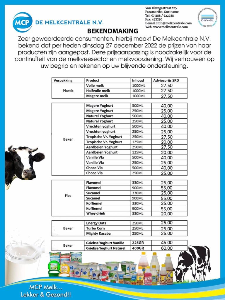 De opkoopprijs van rauwe melk is per 27 december 2022 verhoogd met 25%. Die opkoopprijs is gestegen van SRD 14 naar SRD 17,50 per kilogram en de transporteurstoeslag is aangepast naar SRD 1 per kilogram. Hiermee heeft minister Parmanand Sewdien van Landbouw, Veeteelt en Visserij (LVV) het advies van de melkveesector weer overgenomen.